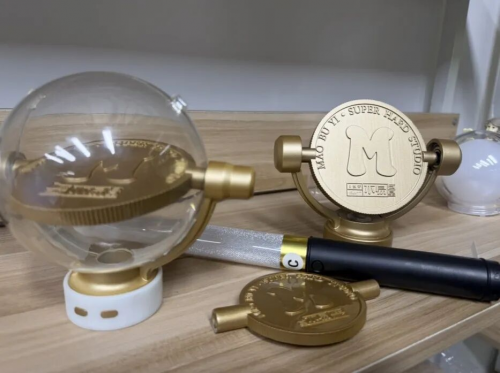 「爆有钱」应援棒核心是巨大金币,装在圆形透明罩内,币面刻有专属字母“M”与“巨星不易”厂牌标识。钥匙造型呼应《二零三》的出租屋生活和毛不易的《明日之子》之路。按下右侧按钮,金币飞速旋转,金色光芒迸发。它有14种颜色灯光变化,单击左侧按钮可切换,透明外壳可拆下定制为“痛棒”,金币部分可作桌面摆件,一物多用。