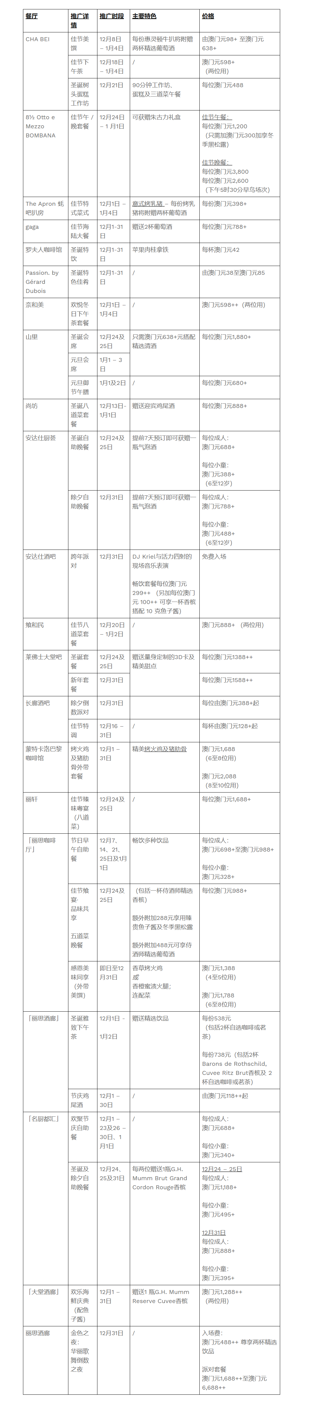 于「澳門銀河」逾15间顶级餐饮选择 ,尽享圣诞及新年佳肴:从高雅下午茶、顶级扒房,到丰盛自助餐、亚洲美馔及国际料理,还有创意佳节鸡尾酒 ,满足每一份渴望。详情可参阅www.galaxyresorts.com.cn/offers/dining/gift-yourself-extraordinary-gastronomic-journey/